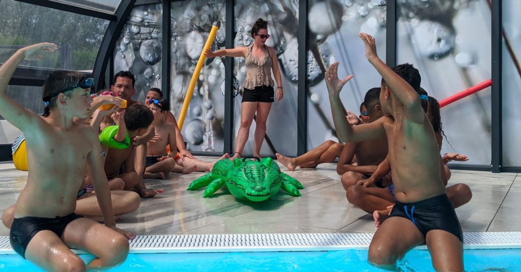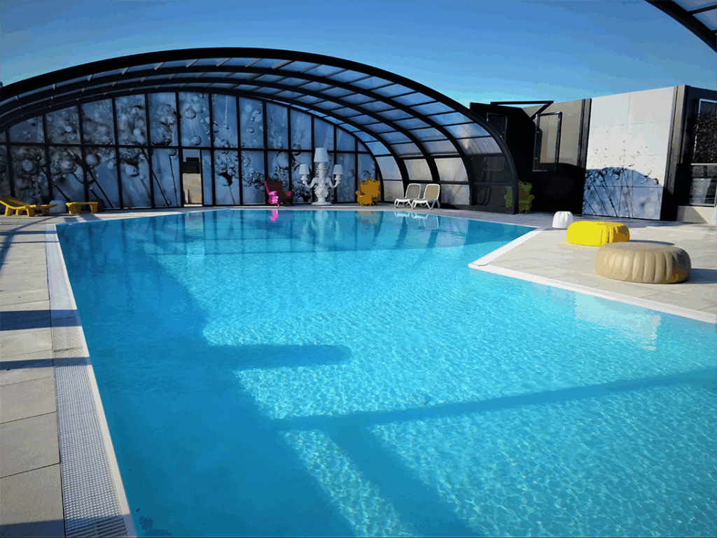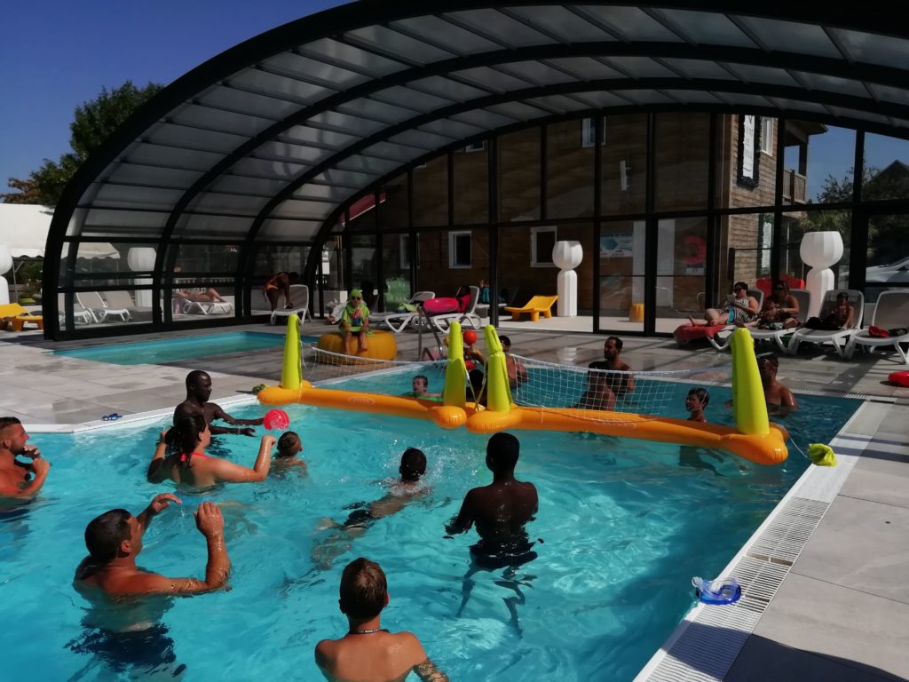 Discover a large pool area with designer furniture, entirely designed for your well-being. The water is heated to 29°C, so you can enjoy every moment of your swim, play with your children or challenge your friends to a game of water volleyball. There’s also a lovely, relaxing beach where you can sunbathe on our deckchairs, and a nearby snack bar for when you’re feeling peckish, and a bar for refreshments all day long in a friendly atmosphere. You’ll never want to leave our pool area! And if the weather turns nasty, the pool can be covered so you can enjoy it with the whole family.