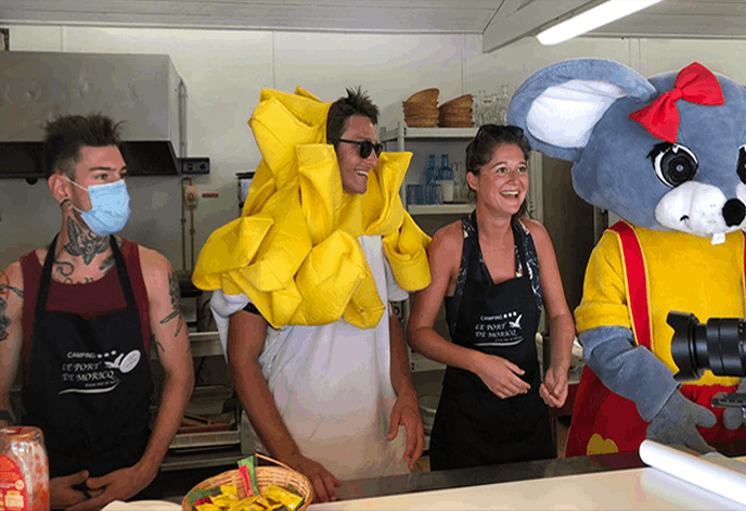 Personnes faisant des glaces au camping, habillées en costumes.