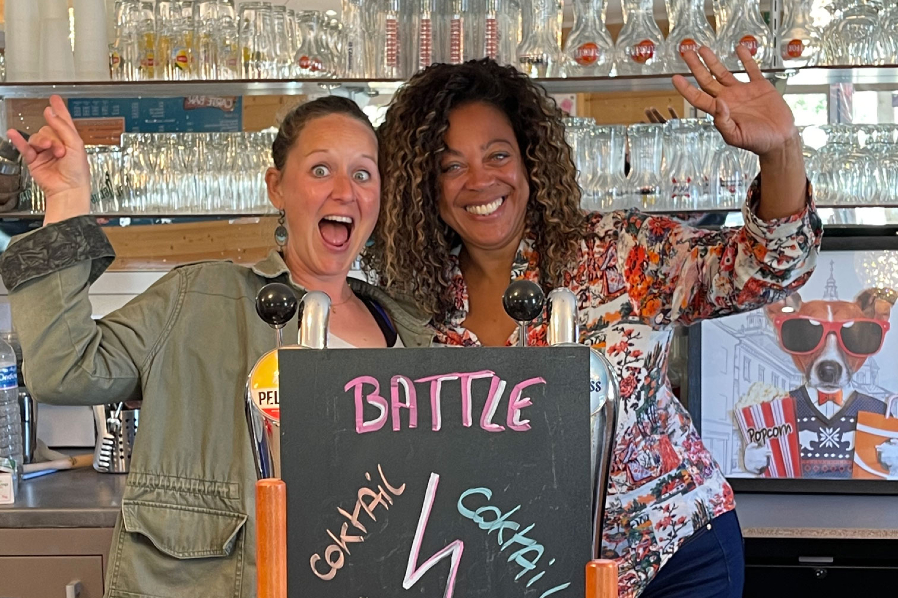 Deux femmes souriantes derrière un tableau de boissons.