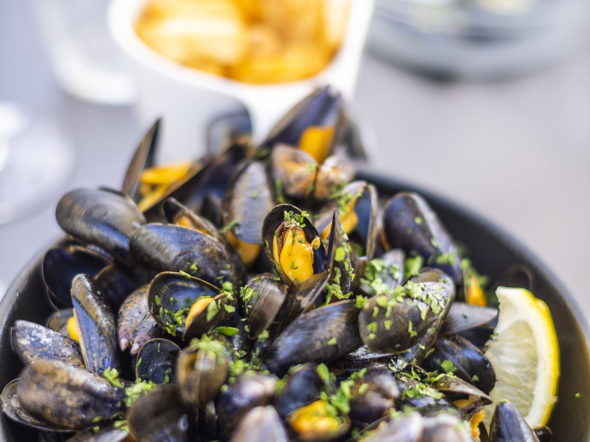 Moules marinières avec herbes et citron.