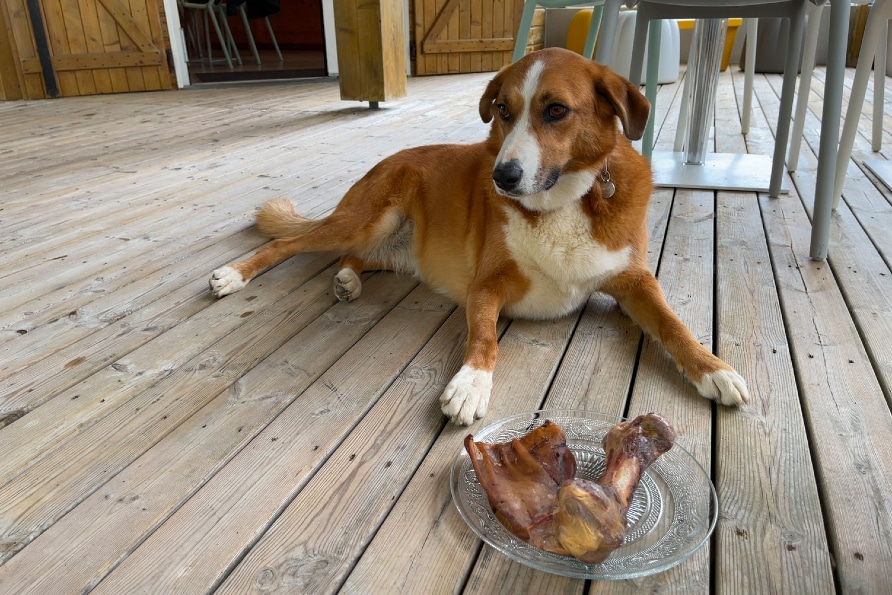Chien couché sur terrasse en bois avec os.