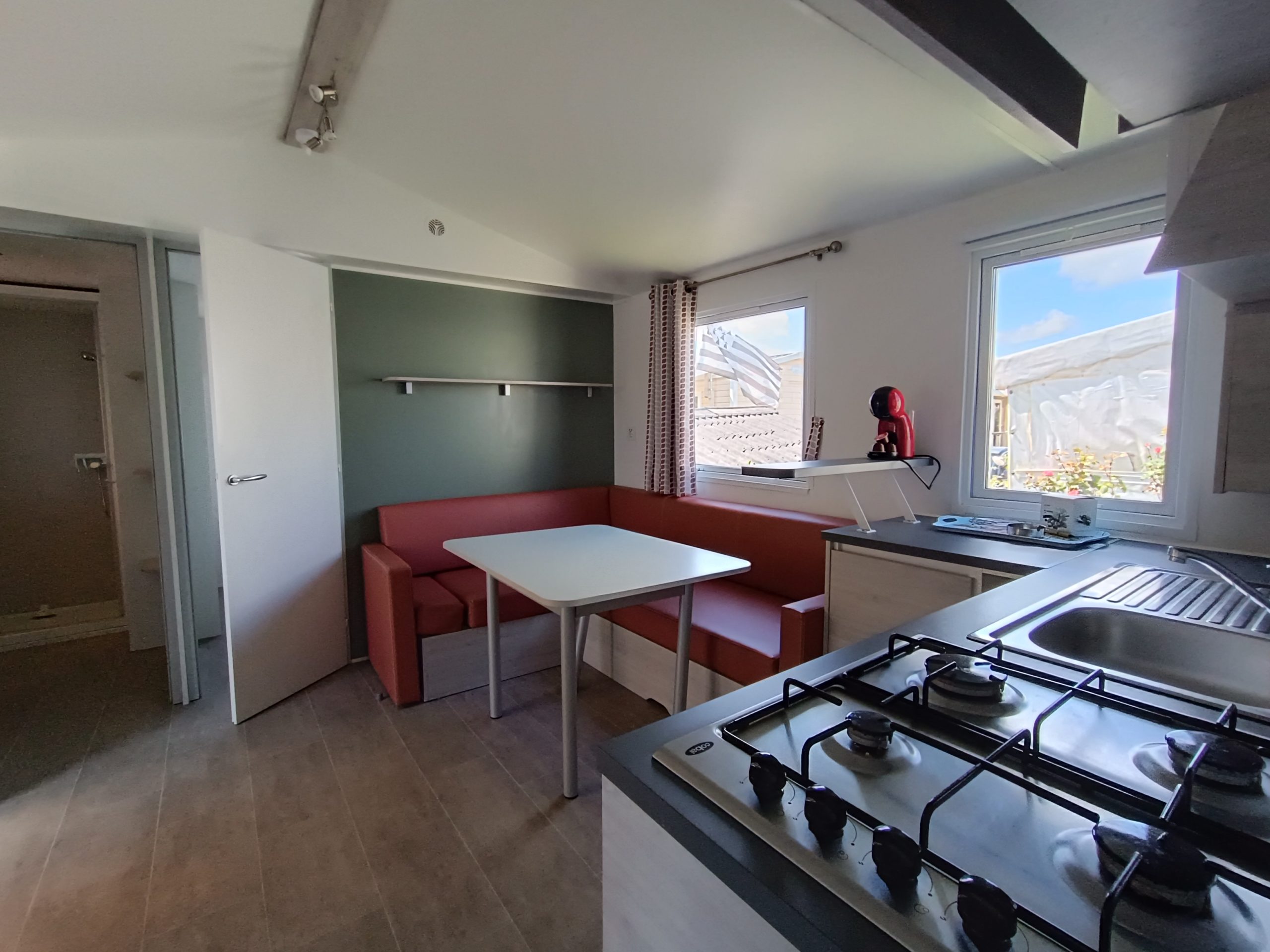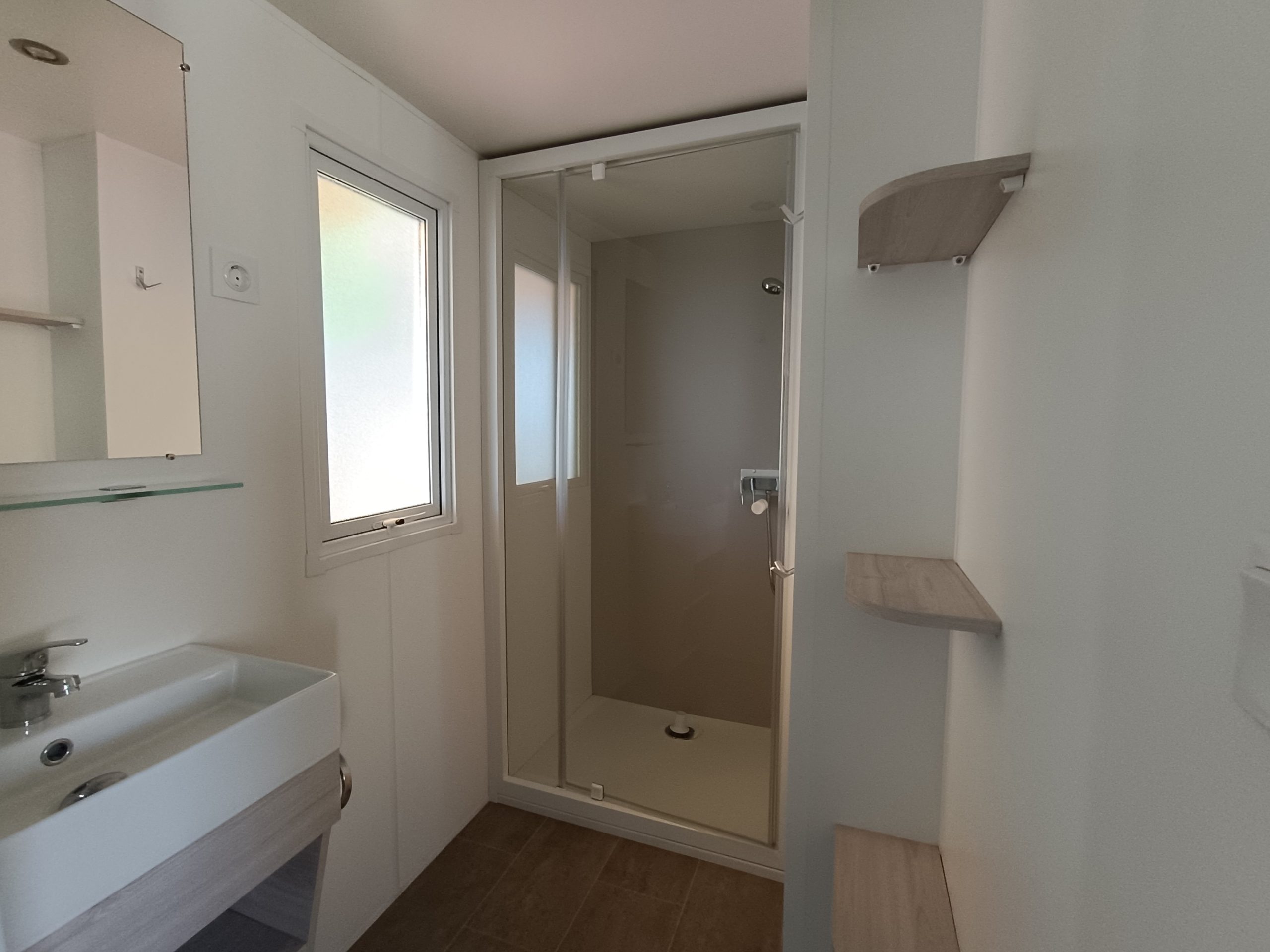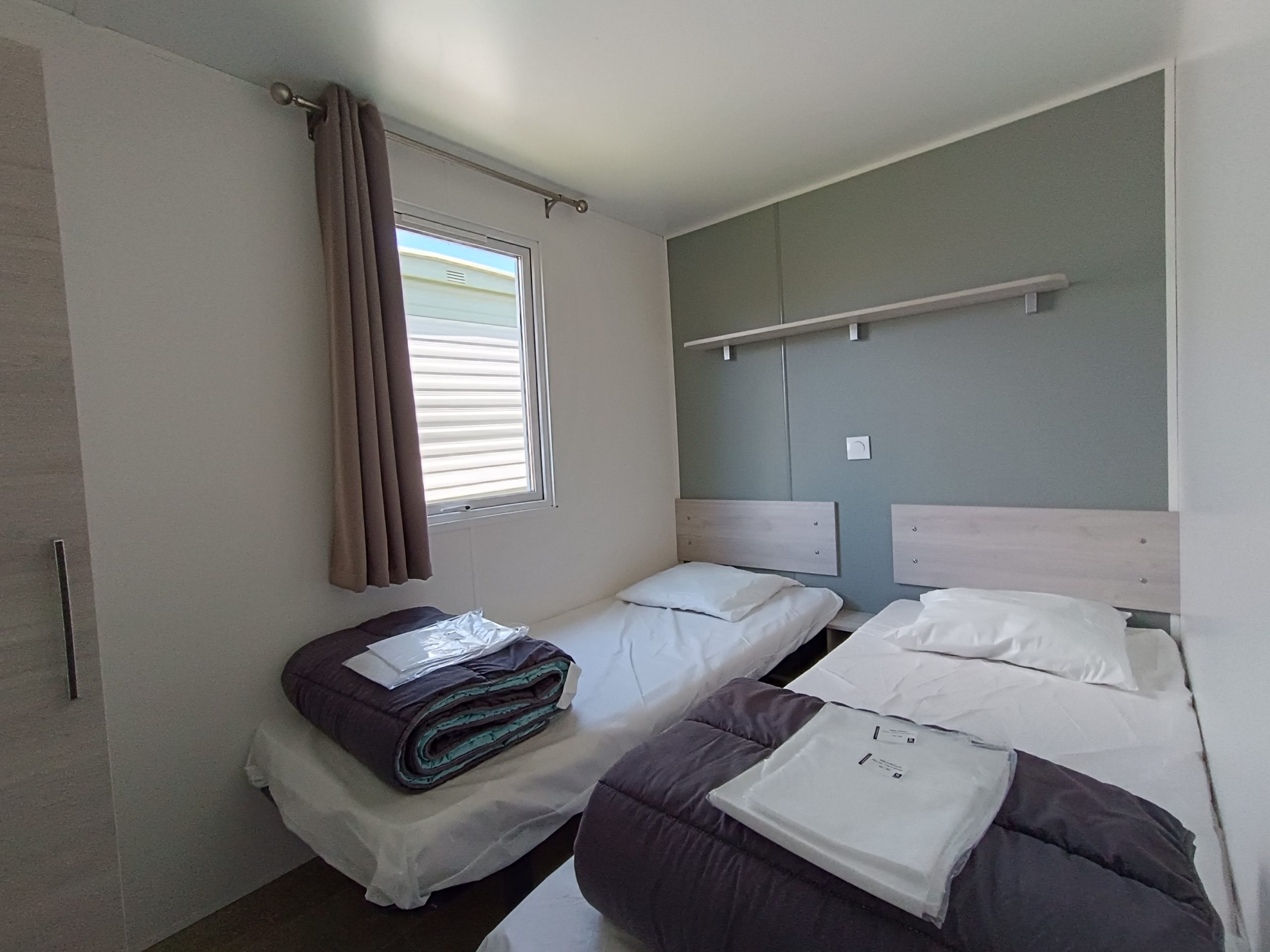 Votre mobil-home Prestige 2 chambres peut accueillir jusqu’à 6 personnes dans un cadre alliant confort et modernité. Âgé de moins de cinq ans, il bénéficie d’une décoration contemporaine et soignée.